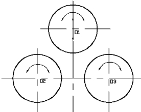 1.1:主傳動指上輥繞O1,下輥分別繞O2、O3作順時針或逆時針旋轉。它是以兩根下輥為主驅動 ,由主電機、主減速機、連軸器、及開式齒輪組成。工作時上輥由板料間的摩擦力帶動,同時作為從動軸,起調整擠壓工件的作用。輔傳動由單獨的傳動系統控制上輥的上升或下降。由上輥升降電動機、減速機、連軸器、蝸輪、蝸桿、絲母、絲桿組成。工作時,由減速機帶動蝸桿轉動蝸輪內絲母旋轉,使絲桿及上輥軸承座作升降運動,使上輥上升或下降。卷板時,在上輥的下降壓力下,通過兩下輥正反轉動,使板料達到所需的曲率,形成預計的圓形或弧形。