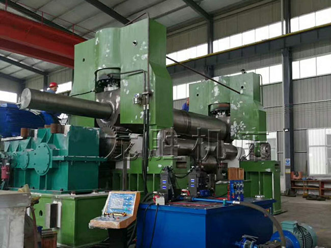 該機屬于液壓型三輥卷板機,用于常溫狀態下將各種容器用碳鋼、低合金鋼一次上料后不需調頭即完成板材端部預彎、卷圓和矯圓等工序。