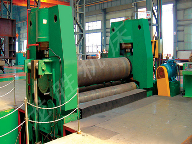 該機結構型式為三輥對稱式,上輥在兩下輥中央對稱位置作垂直升降運動,通過液壓缸內的液壓油作用于活塞而獲得,為液壓傳動,兩下輥作旋轉運動,通過減速機的輸出齒輪與下輥齒輪嚙合,為卷制板材提供扭矩。